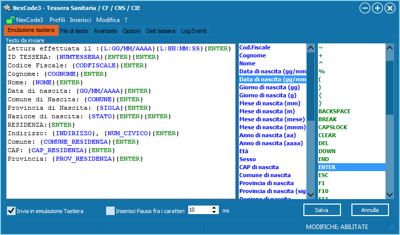 Adesso riportiamo l'esempio della trascrizione automatica di dati contenuti in una tessera su un documento vuoto. Rispetto all'esempio precedente, in cui venivano riportati direttamente i contenuti della tessera, in questo caso vogliamo illustrare la possibilità che NexCode3 offre di preimpostare dei messaggi fissi, che verranno riportati insieme ai campi letti sul nostro documento. Ad esempio, scrivendo Nome: {NOME}; nelle impostazioni di tessera sanitaria e strisciando più tessere, il risultato sarà : "Nome: GIACOMO; Nome: Alessandro; Nome: Marco; " etc. Per l'elenco dei caratteri riservati e la legenda dei tasti e dei comandi, consultare l'apposita sezione del manuale. Andiamo ad effettuare le nostre impostazioni, inserendo la descrizione (costante) accanto a ciascun campo richiamato (variabile).