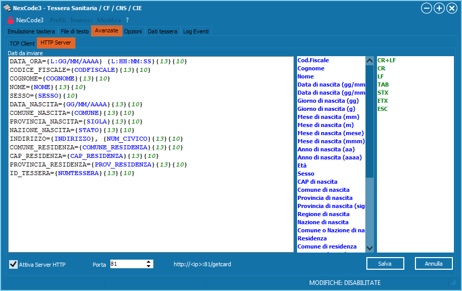 - Configurare la sequenza da inviare come risposta HTTP, in modo analogo alle configurazioni per Emulazione tastiera, Salvataggio su file e Client TCP.