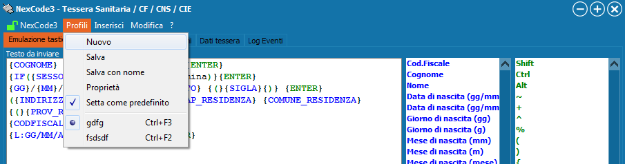 Ogni volta che verrà aperto il software "NexCode3", verrà caricato automaticamente il profilo impostato come predefinito; per settare un profilo come predefinito, selezionarlo dalla lista presente nel menù orizzontale "Profili" dopodiché, all'interno dello stesso, cliccare col tasto sinistro del mouse sulla voce "Setta come predefinito".