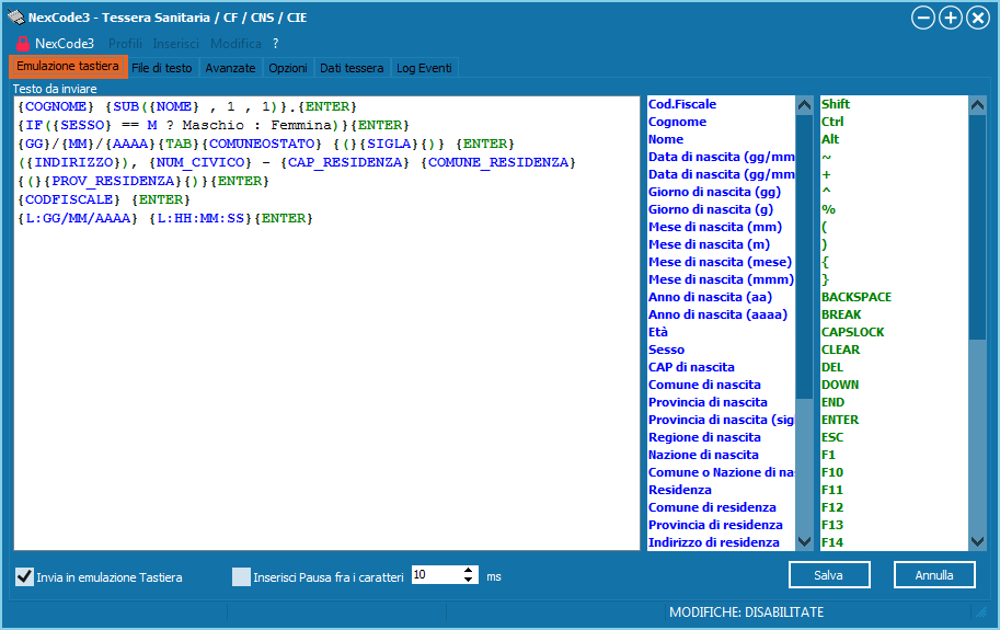 La configurazione si divide in sei sezioni, "Impostazioni", "Emulazione Tastiera", "File di Testo", "Avanzate", "Opzioni", "Dati Tessera", "Log Eventi" alle quali sono dedicate i paragrafi seguenti.