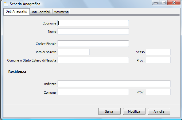 Qui sotto riportiamo un form vuoto di un software "personalizzato", in attesa di essere compilato con i dati contenuti in una tessera sanitaria o in un tesserino di codice fiscale.