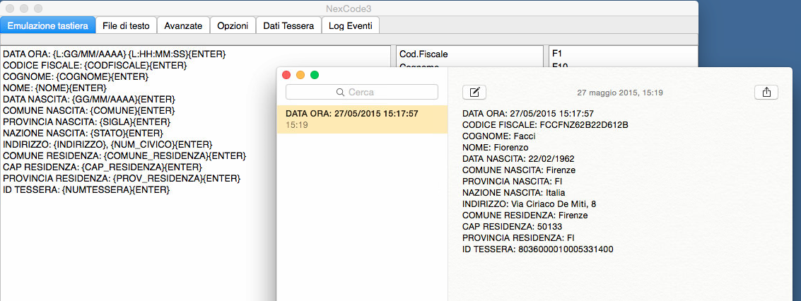 Dopo aver strisciato una tessera sanitaria, il risultato sarà il seguente: ATTENZIONE: non tutti i campi sono disponibili sulla banda magnetica. si rimanda alla legenda campi per un dettaglio relativo. |