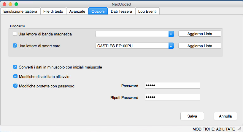 - Modifiche disabilitate all'avvio. Se selezionata, alla partenza le modifiche non saranno abilitate finchè non si eseguirà la funzione "Abilita Modifiche"